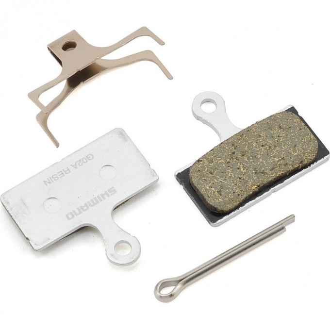 Тормозные колодки Shimano G02A, композитный состав, с пружинкой и шплинтом. Подходят для дисковых тормозов Shimano BR-M9000, BR-M9020, BR-M987, BR-M985, BR-M785, BR-M675, BR-M666, BR-M615, BR-S700, BR-CX75, BR-RS785, BR-R785, BR-R515, BR-R315.